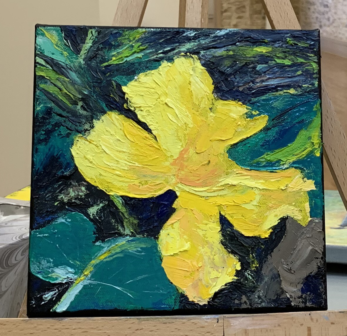 I liked the way the dark space bottom left between the leaf and the flower matched the upper right corner. The dark contrast worked well, but it also left me feeling isolated somehow. So I worked the flower with tiny gradations of yellows and even pale pinks.