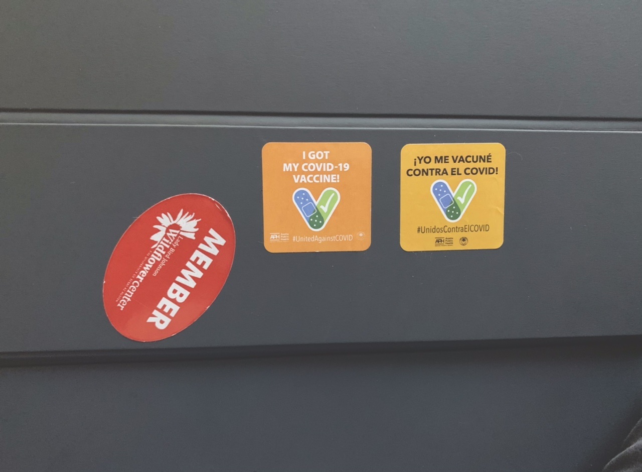 The picture above is the cover to my iPad with the two stickers from our shots, plus one from the Lady Bird Johnson Wildflower Center that predates the pandemic 😊