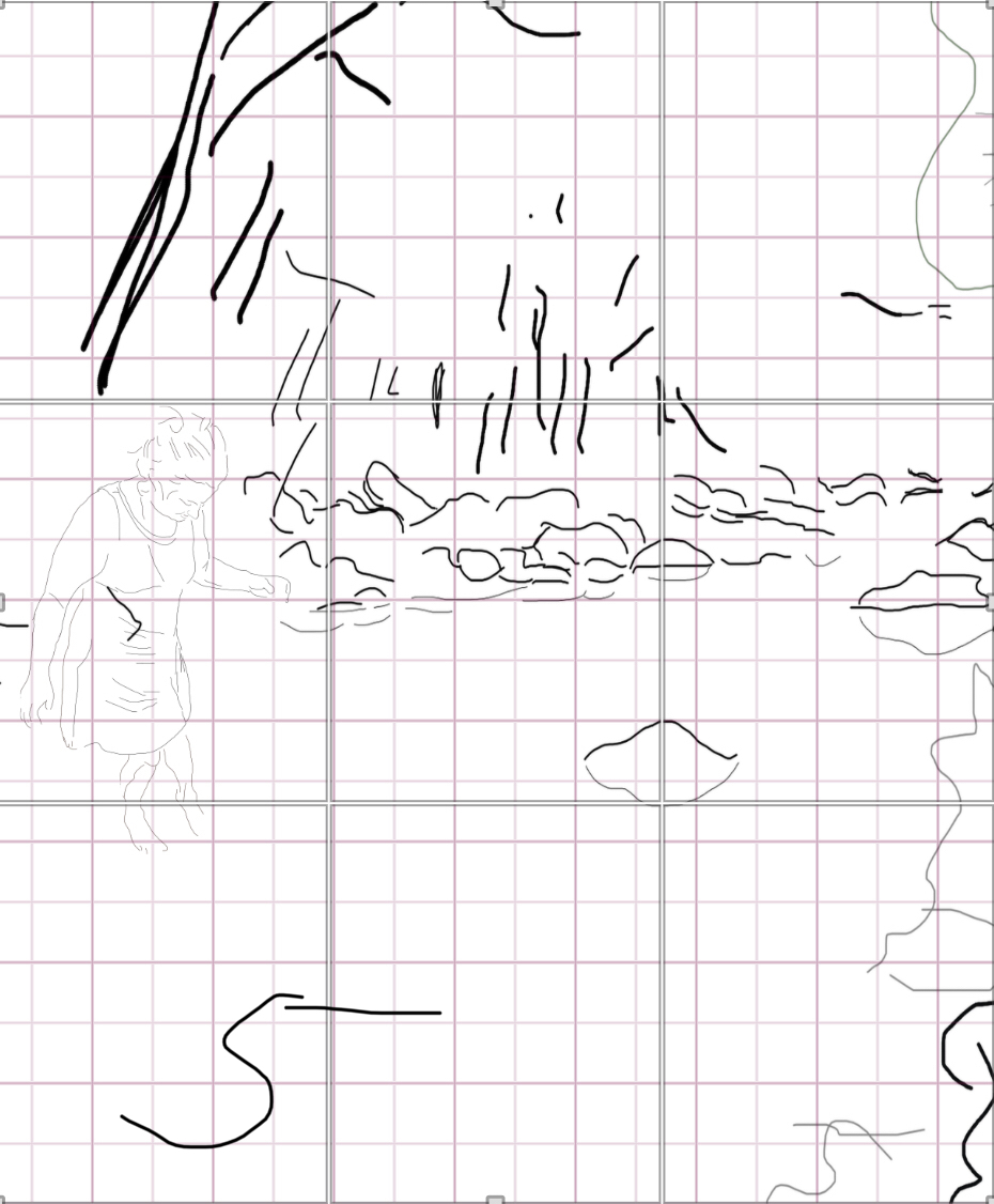 I’d divided up my proposed line work for my newest 25×40 (acrylic this time though) into 12 ten inch high segments the day before (to fit the 40 inch height), and yesterday I created files I hope to print out and use as templates to get the dimensions and proportions the way I want them on the canvas. Especially the one with the figure art.