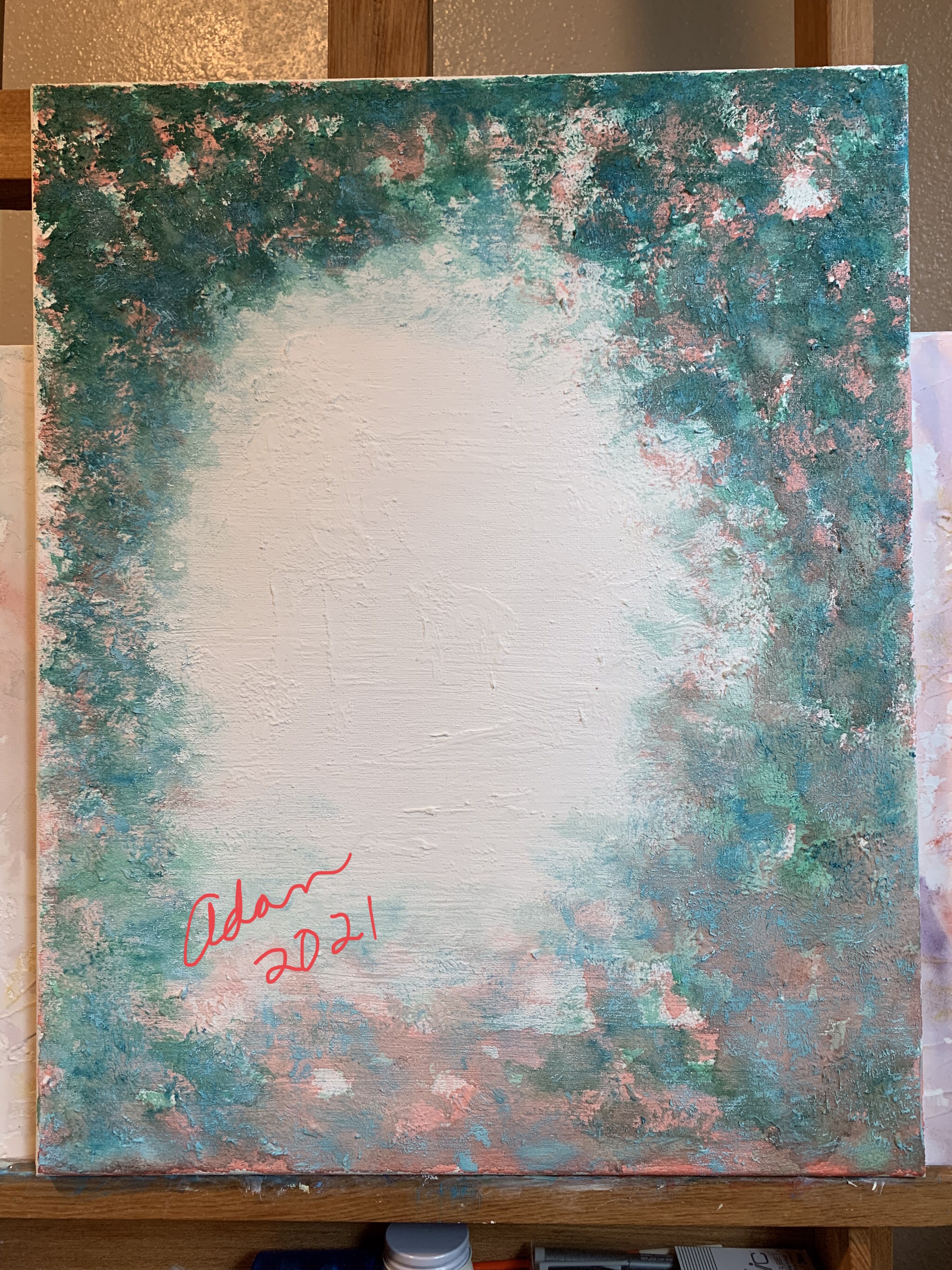 The figure in the detail above is faintly visible in the green/red acrylic, which if I decide to switch up and make more “holiday-ish”, I could wet-sand them down a bit. Or overlay more light molding paste to reflect a totally different view and (hopefully) final fulfilling feel ☺️