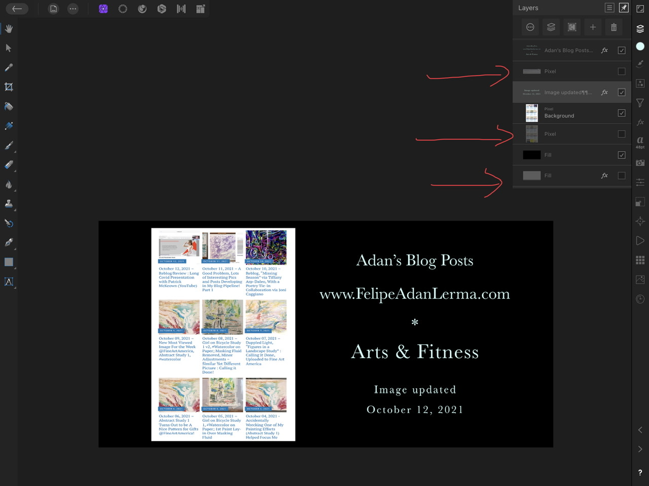 Here’s a screenshot of my workspace for this new blog post tweet format via Affinity Photo. The red lines I “marked up” via my iPad highlight material that’s “unchecked”, meaning not visible on my work space unless I re-click them. I’m pretty sure I’m not gonna want that small scrunched up header atop my featured images, or the old featured images screenshot for 10.09.21, but it won’t cost me much to keep them for now.