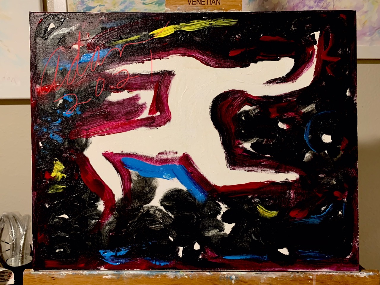 Second, regarding the iffy title, lol! I’d intended this to be a stand-alone painting, saw it morph from more a female abstract to a male abstract, and decided, nope, not gonna trim / curve the figure more than what it is; I “may” horizontally invert the figure and do a companion piece – thus, Duet! I usually, wish me luck, but this time I gotta say, wish me a few buckets of that good stuff!