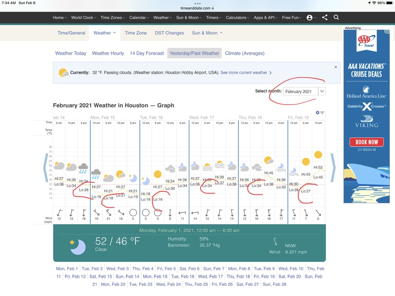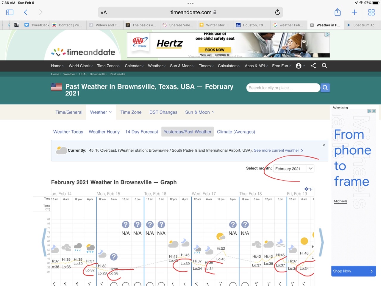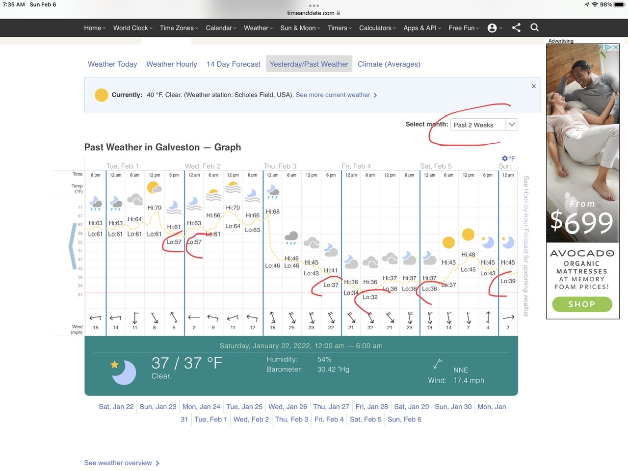 So, further below my wife & I’s personal experience update ( as per my recent posts ) during this years storm, are a string of comparison weather data charts via timeanddate.com for Austin, Houston, Galveston, Brownsville, and San Antonio – which clearly shows the differentials of both temps and breathe of storm / cold temperature readings. My apologies to other areas of our far reaching state, equally important, but beyond what I could do here for now, time or energy wise. Info is available though on the site noted above – timeanddate.com .