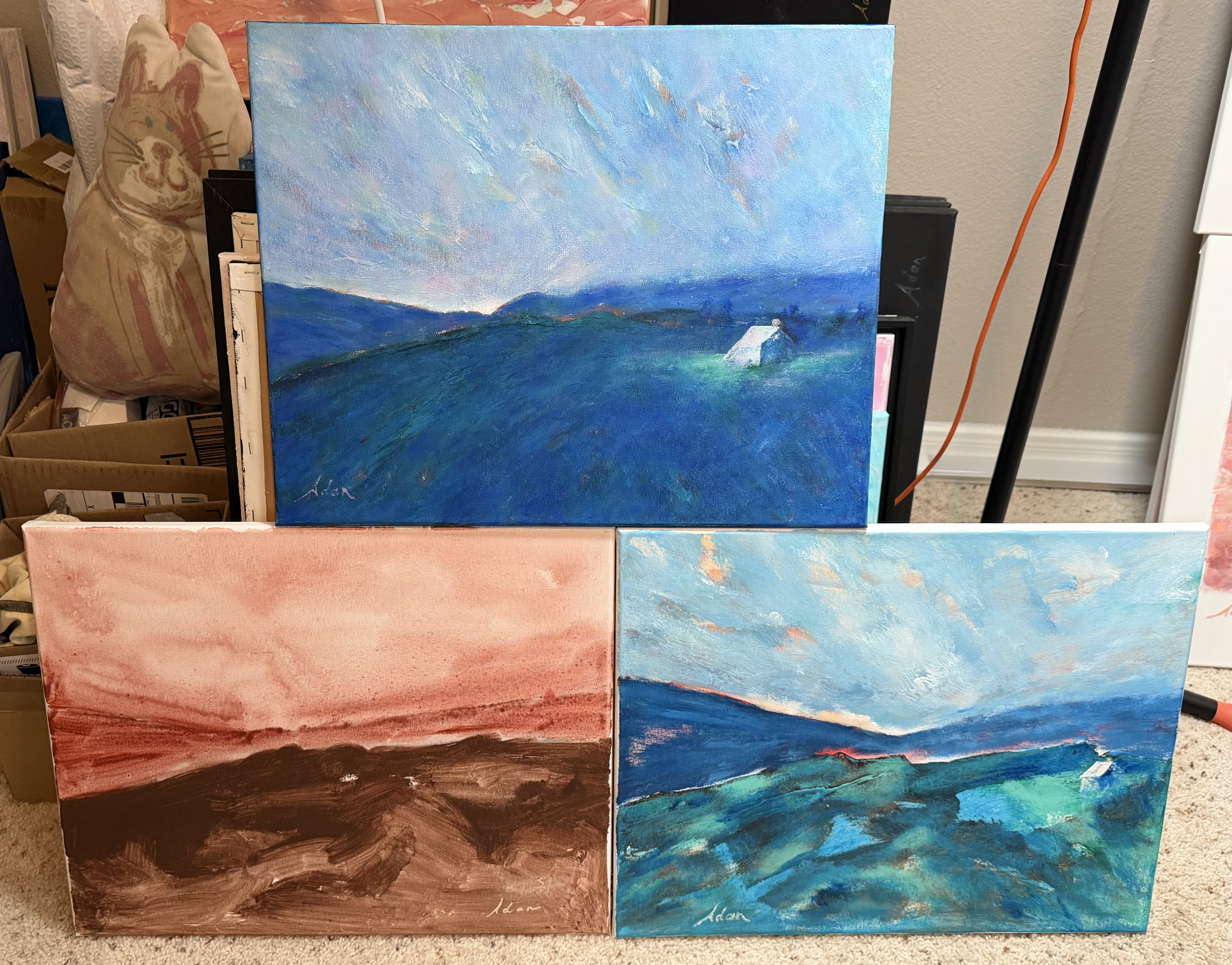 What I’d like to do next re posting is do a short write up about each of the three paintings in this set, and continue painting of course. I already have a 2nd set of paintings I’m completing, based on a 2018 sunset in Vermont (5 canvases; some small), plus, have chosen a 2012 Paris image for a probable 3 paintings 3rd new set.